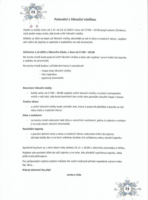 do Vašich poštovních schránek byl doručen letáček "Putování s Vánoční vločkou". Jedná se o adventní hru v Čankovicích, která vybízí k procházce po obci a hledání svítící vločky podle mapy. Hra Vás provede nejen po Čankovicích, ale provede Vás i tradicemi Vánoc, ozdobíte si vlastní stromeček a rozluštíte tajenku. Na své si jistě přijdou malí i velcí. Začínáme 1.12. od 17 hod u Obecního úřadu. Hra bude zakončena 23.12. v 16:00 hod u obecního vánočního stromečku, kde na děti (po předložení vyplněné tajenky) čeká ještě malé překvapení.
