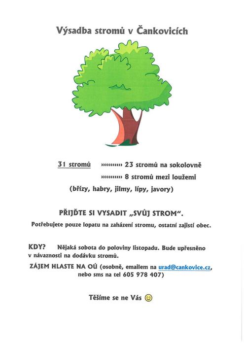 Zveme všechny zájemce o sázení stromů na akci výsadby stromů v Čankovicích. Datum bude upřesněno dle dodávky stromů. Měla by to být nějaká sobota do poloviny listopadu. Pro přehled o počtu lidí Vás prosíme o nahlášení zájmu na OÚ.